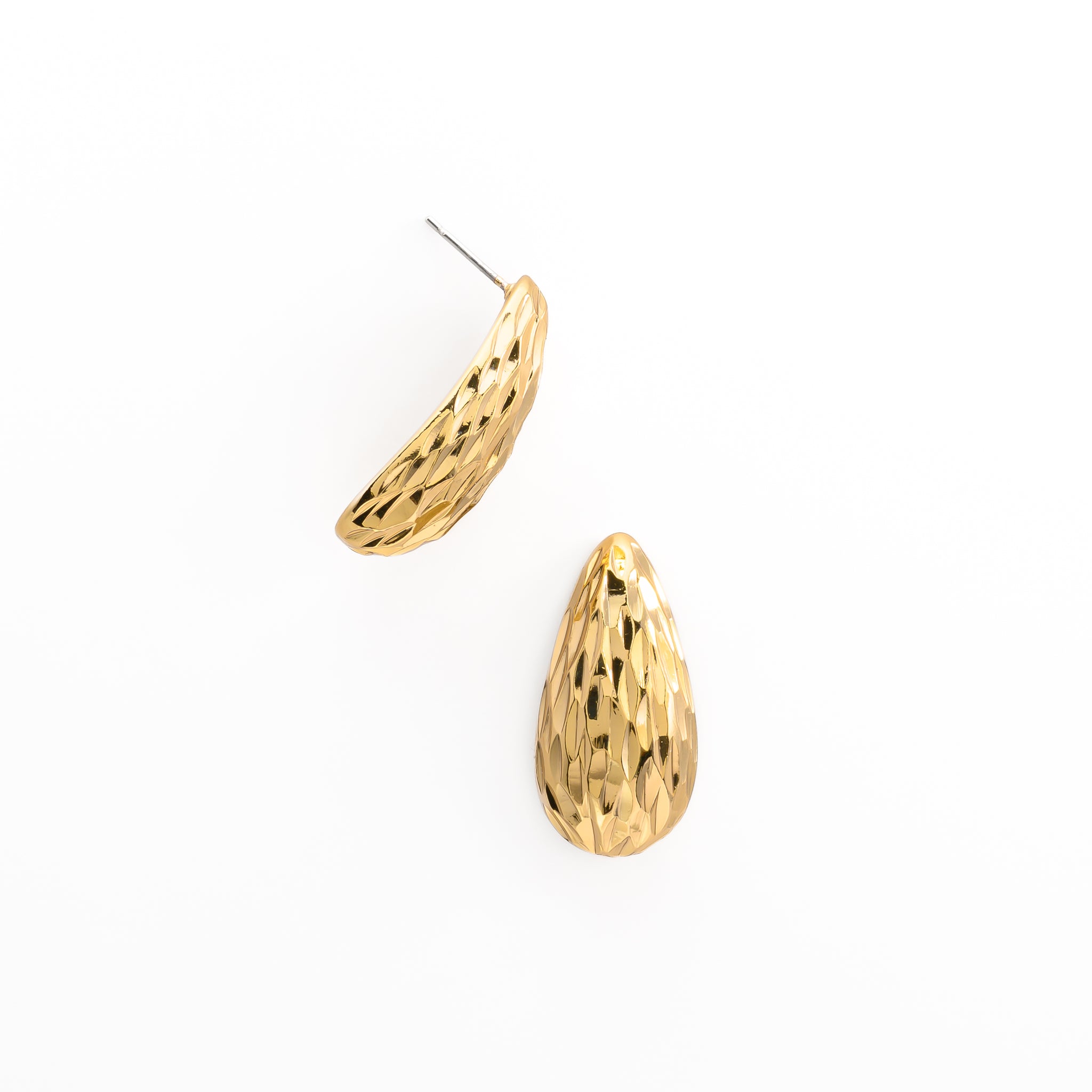 ARETE GOTA OVALADA TEXTURA CORTES. Baño de Oro. Joyería hipoalergénica....